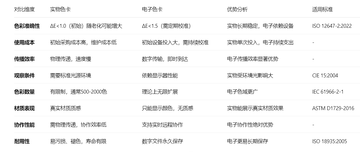 电子色卡在传播和检索方面具有明显优势,可通过网络瞬时共享,支持关键词搜索和智能筛选。实物色卡则需要物理传递,但其无需设备依赖的特性,在现场比对和材质评估时更为直接可靠。特别是在光照条件可控的环境下,实物色卡能提供最真实的色彩参考。