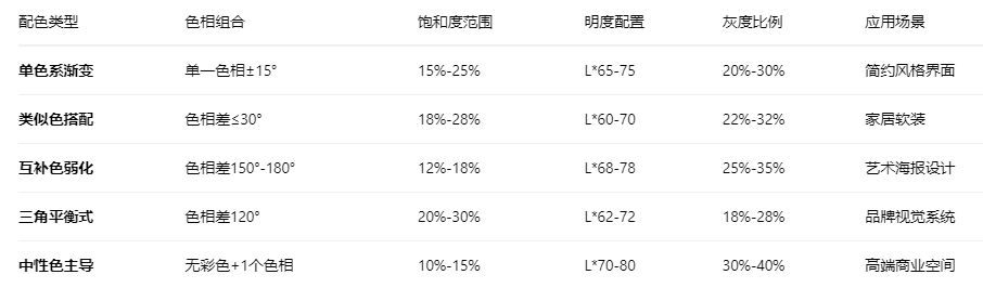 色彩过于平淡是常见问题。解决方案是引入小面积对比色,选择色相环间隔120°-150°的色彩作为点缀,但将饱和度控制在12%-15%,明度与主色保持协调。另一种方法是使用明度对比,将关键元素的明度调整至与背景ΔL*≥15。