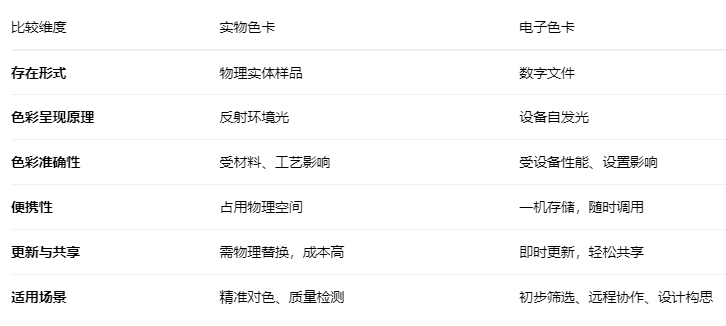 电子色卡与实物色卡各有其独特的优势和局限性。电子色卡在便捷性、传播速度和成本效益方面表现突出,特别适合数字媒体和设计初期的色彩工作;而实物色卡在色彩准确性、物理材料匹配方面具有不可替代的价值,是高质量制造行业的必备工具。