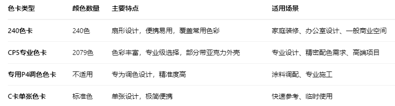 240色卡作为最普及的版本,采用扇形设计,包含从中性基础色到流行色的全面选择,足以满足大多数家庭装修需求。