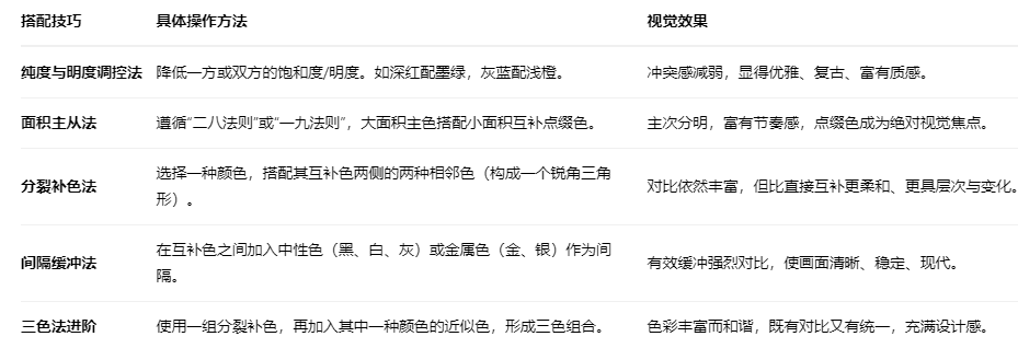 直接使用高纯度的互补色,虽能瞬间吸引眼球,但也极易造成视觉疲劳和廉价感。高级的搭配在于控制与调和。