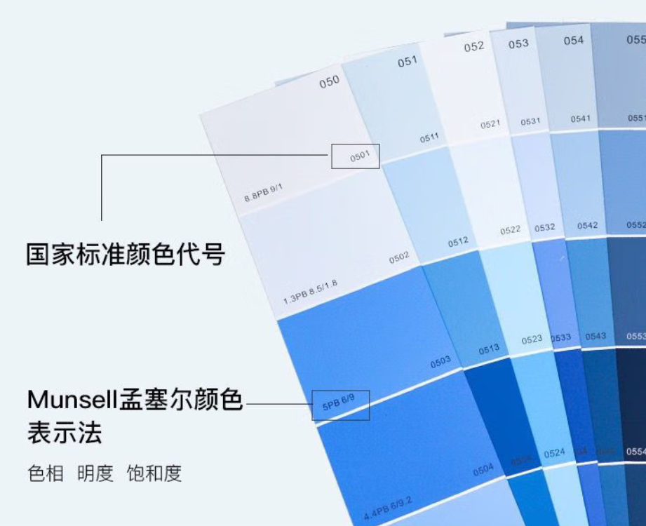 对于无彩色系(黑、白、灰色),标号方式为NV,其中N代表中性色,V表示明度值。例如N5表示中等明度的灰色。彩色系的标号方式则为HV/C,其中H代表色调,V是明度值,C表示彩度值。例如2.5R/5/10表示偏红的色调、中等明度和较高彩度。