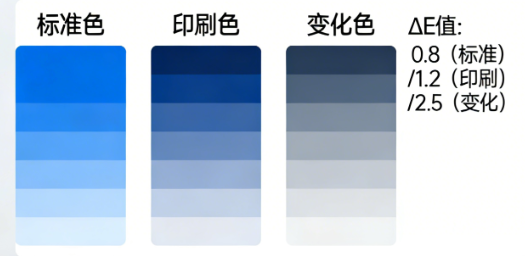 测量每一被测印张的CIE LAB的L*、a*、b*数据并计算相对于批量产品平均值的差值△L*、Sa"和△b*,计算△L*、la"和△b*的平均值以及标准偏差,然后将标准偏差乘以1.96,确定95%置信度范围(即 95%样品所处范围)。最后计算每一平均值及置信度范围的CIE LAB色差(△E』)。由平均值得到的色差表示印品与付印样的色偏差,由置信度得到的色差表示批量印品之间的颜色变化。