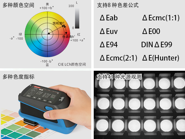 丰富颜色空间:支持 CIE LAB、XYZ、Yxy、LCh、CIE LUV、s-RGB、HunterLab、βxy、DIN Lab99、Munsell (C/2) 等多种颜色空间,满足不同行业标准需求。
